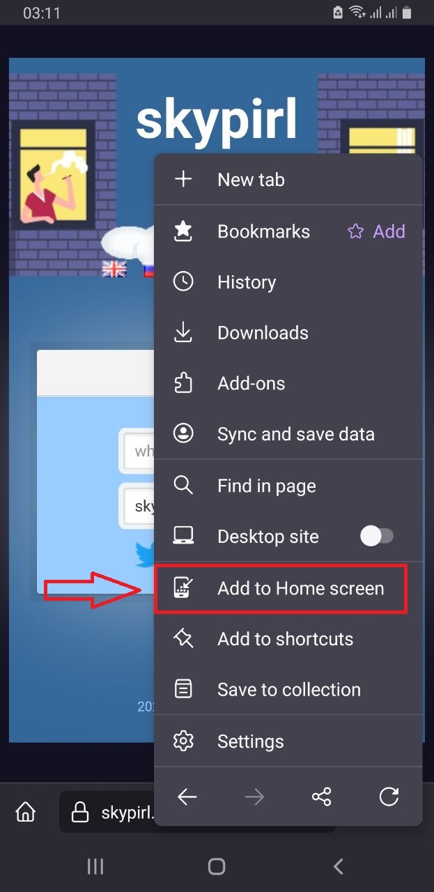 On Firefox brower, click "Install App" or "Add to Home screen"