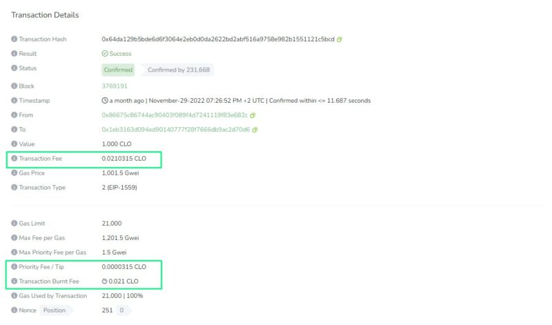 0.021 CLO were burnt during this transaction (Callisto Network testnet).