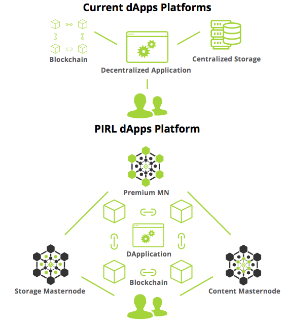 PIRL đã tạo ra nền tảng ứng dụng phi tập trung thực sự đầu tiên được cung cấp bởi mạng PIRL Masternode. Các công ty chuỗi khối khác đã phát triển nền tảng DApp bị giới hạn vì dữ liệu duy nhất có thể được xử lý trong chuỗi khối bị giới hạn ở văn bản đơn giản. Điều này buộc người dùng phải triển khai các giải pháp lưu trữ tập trung cho dữ liệu cần thiết để chạy đầy đủ các ứng dụng phi tập trung của họ. Một ví dụ về điều này là nhu cầu về một máy chủ tập trung để hiển thị các tệp hình ảnh hoặc đồ họa.