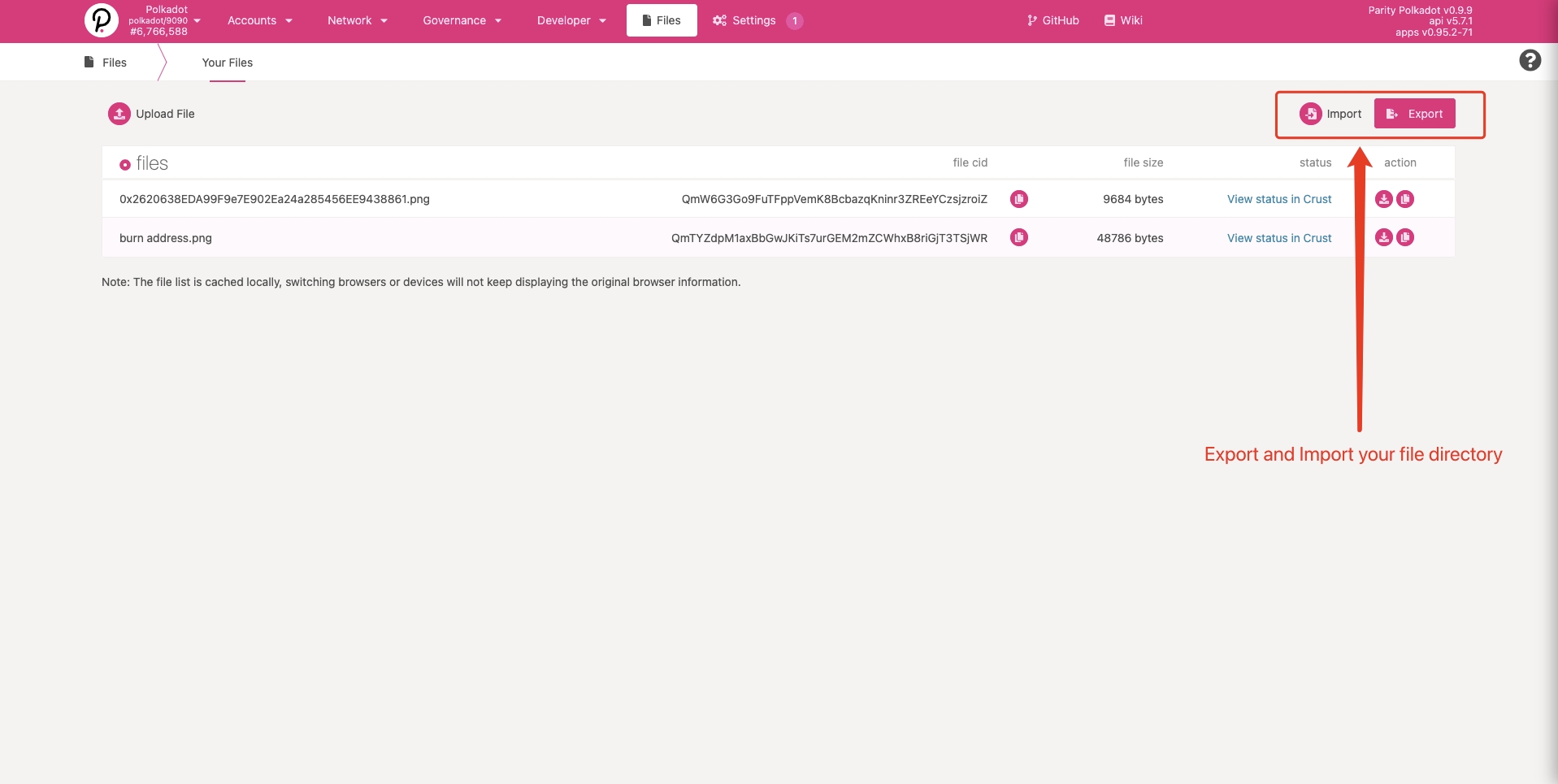 The whole files module is decentralized, so your file directory is only cached in browser. The file directory info will not be visible if you switch to a new browser or clear the browser cache. The storage module allows you to export file directory info from the current browser and import it to the new browser.