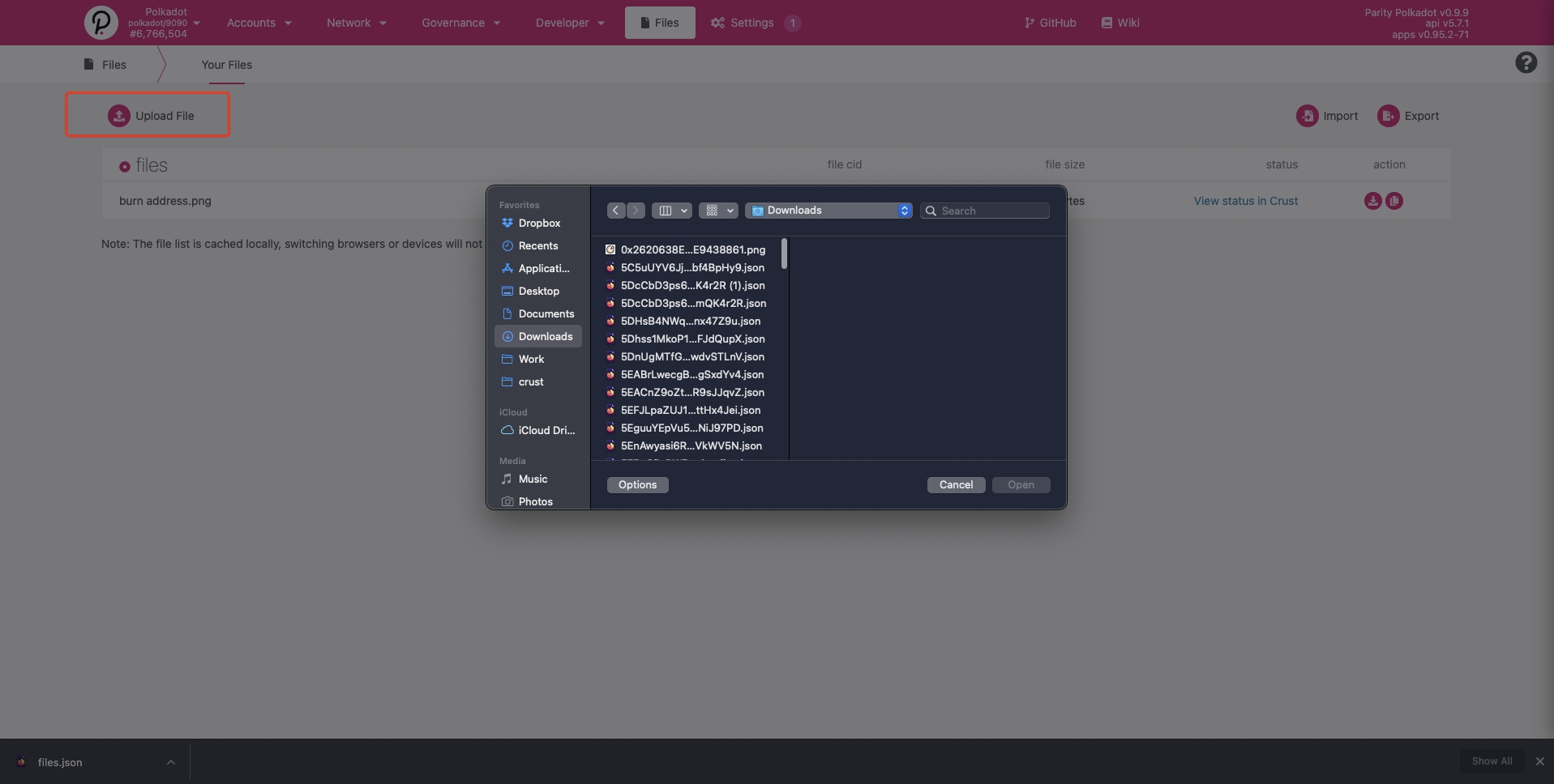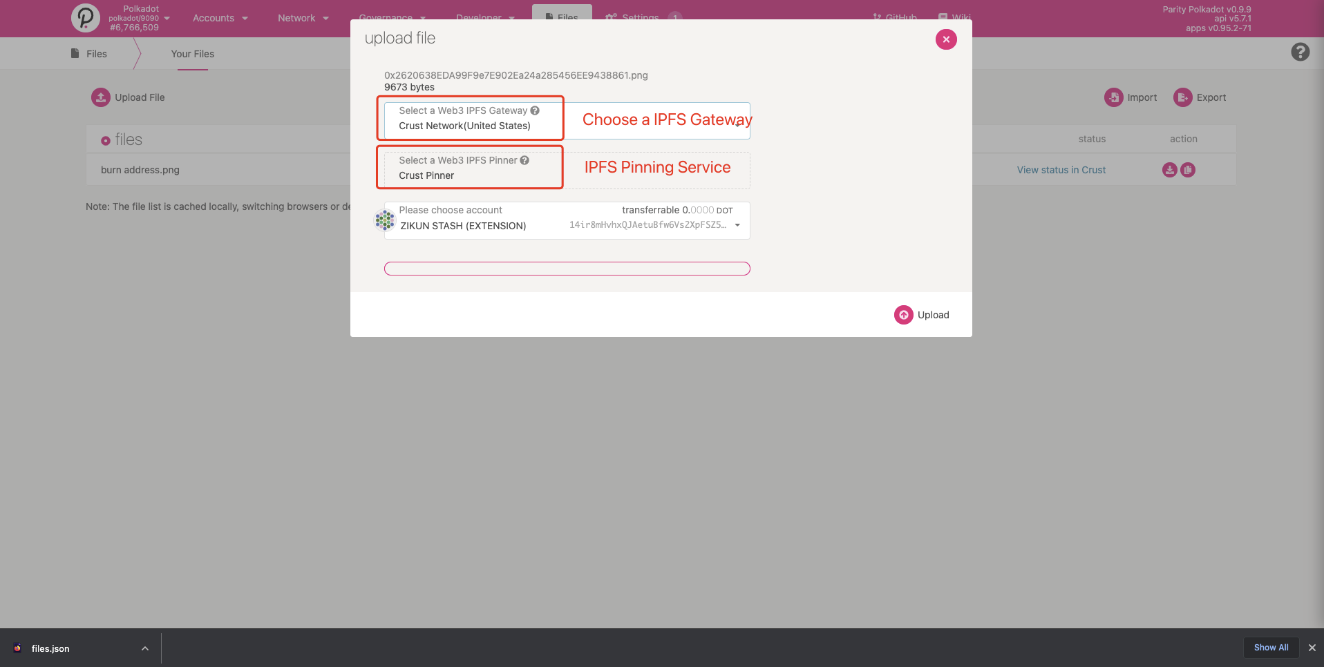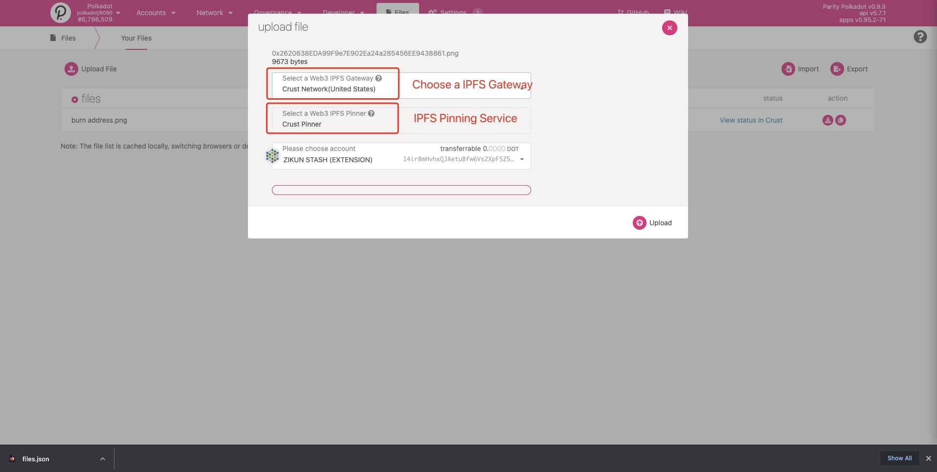 PolkadotJS Apps includes a decentralized storage module that allows Substrate-based chain users to upload their files to IPFS W3Auth Gateway and use the IPFS W3Auth Pinning Service to pin their files on Crust Network.