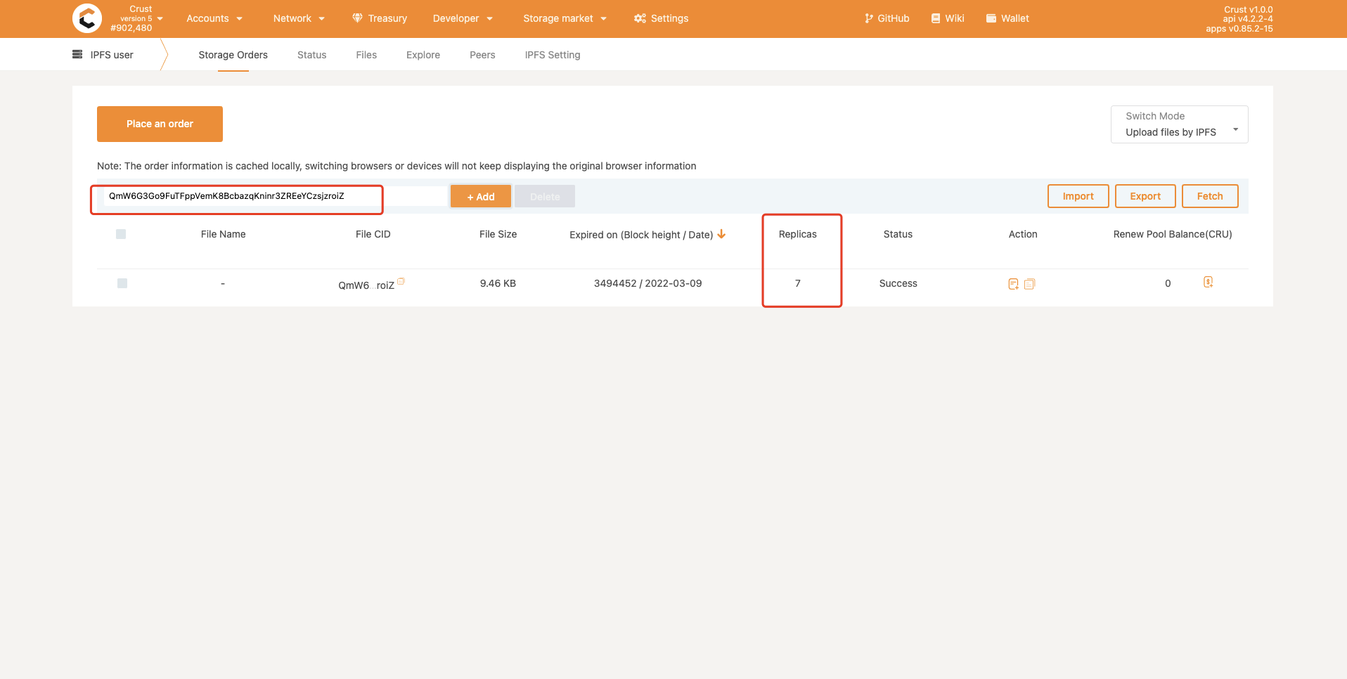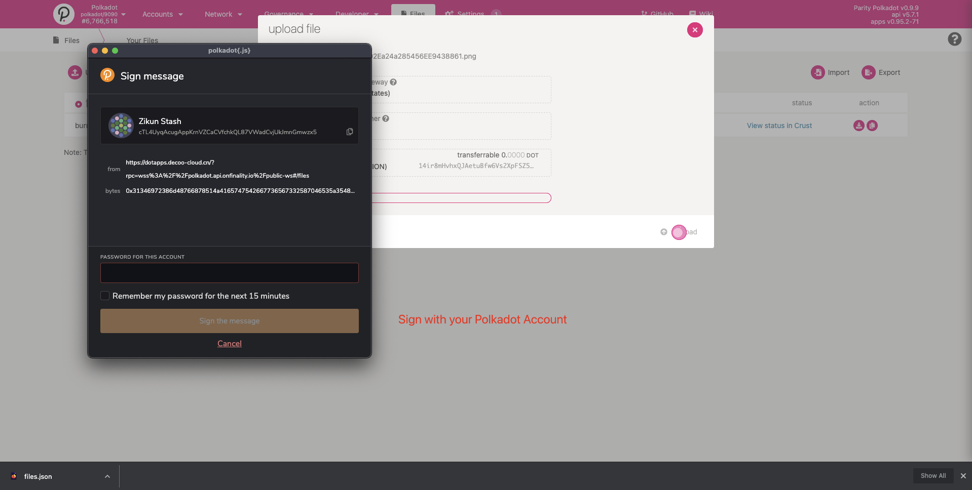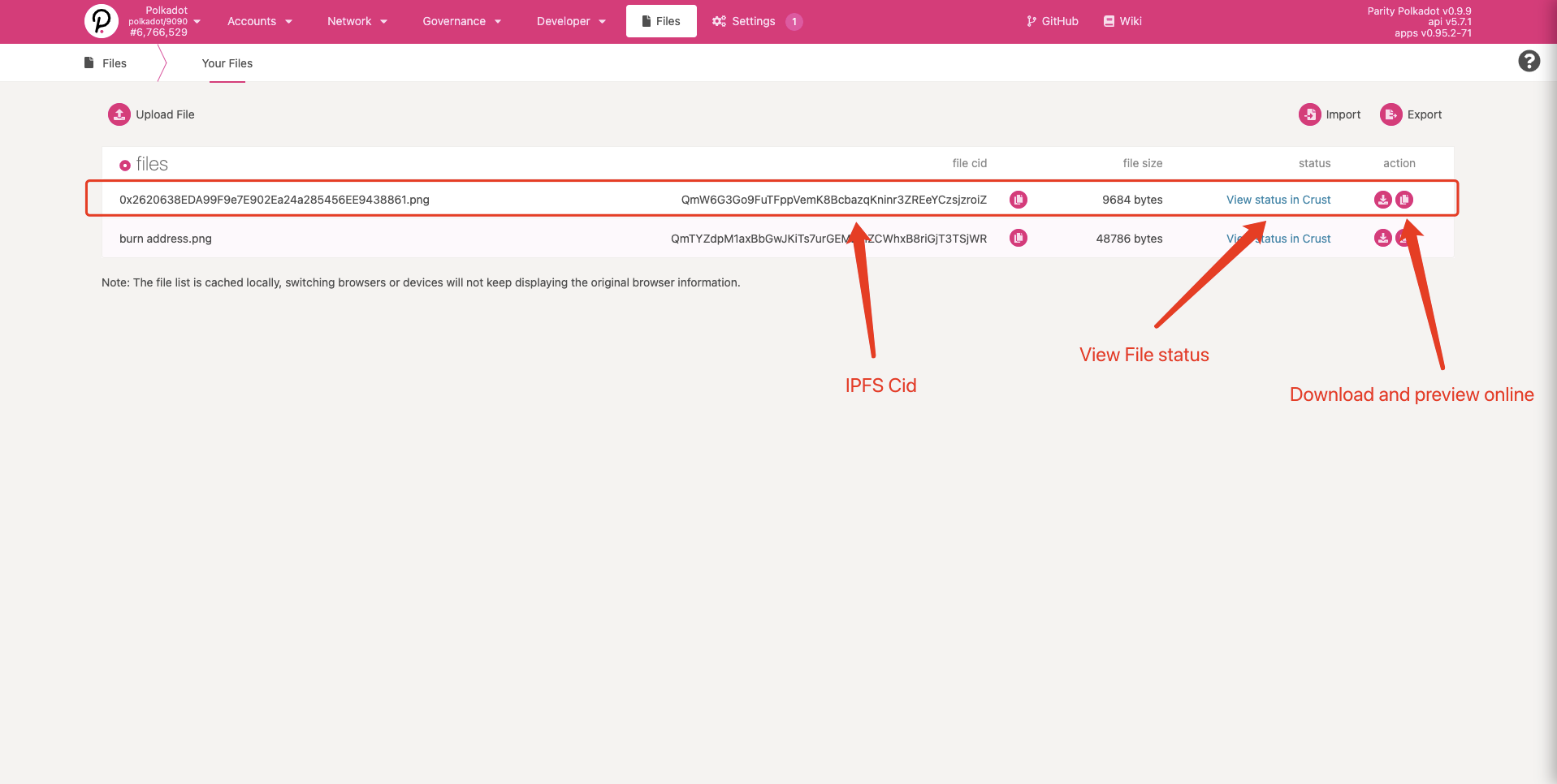 PolkadotJS Apps includes a decentralized storage module that allows Substrate-based chain users to upload their files to IPFS W3Auth Gateway and use the IPFS W3Auth Pinning Service to pin their files on Crust Network.