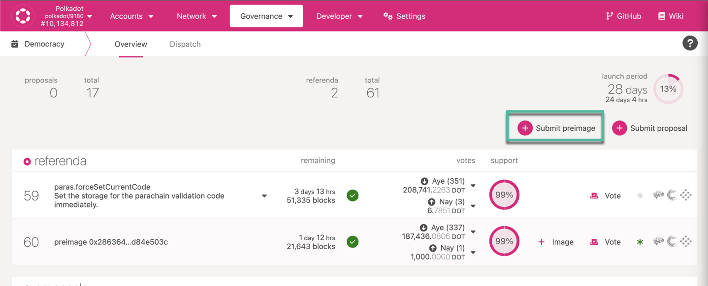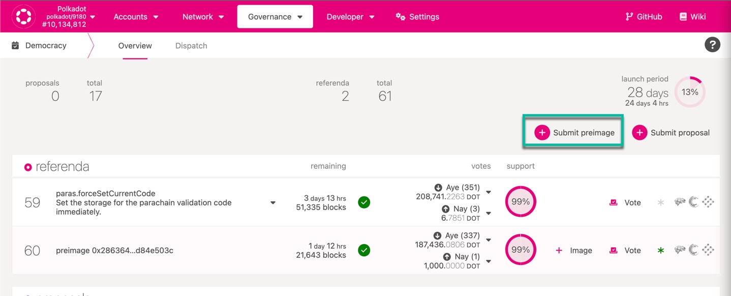 Once the community has given enough feedback (we expect these proposal to be non controversial) please submit the image on the discussion post in the Democracy tab on Polkadot JS Apps, by using the "Submit Preimage" button: