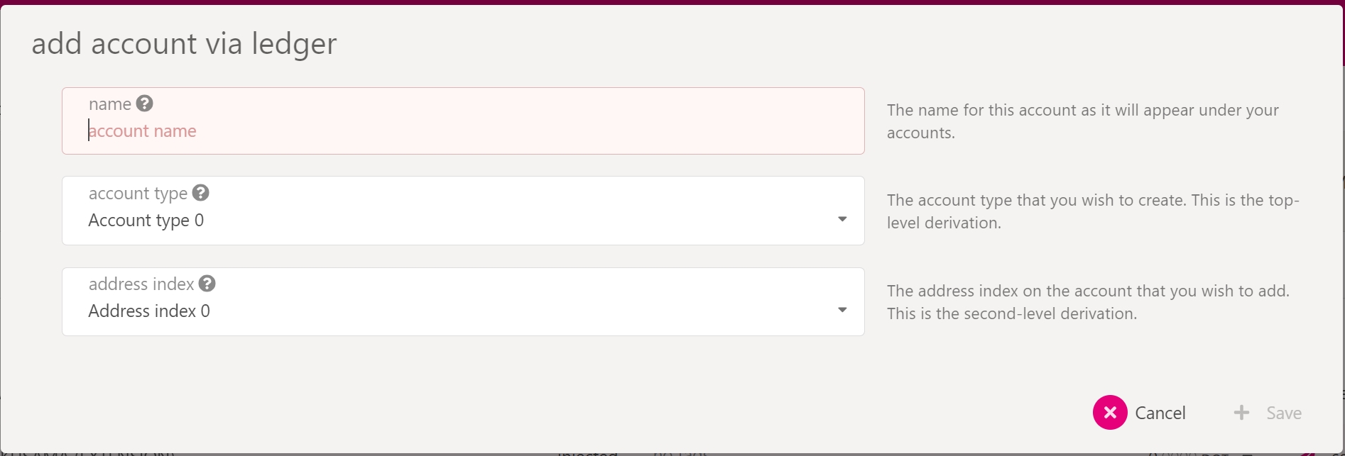 The first input will let you name your account if you have not done so already. If you have already named your account, this will not change the existing name. The first dropdown lets you select an account. You can have multiple accounts on a single Ledger device. The second dropdown lets you pick a derivation path - think of it like a formula from which child accounts are generated. If in doubt, pick the first option for both. 0 / 0 is a good default.