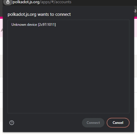Once you confirm your selection, depending on your browser and its security settings, you might need to confirm the USB connection through a popup like the one below when adding the Ledger device for the first time: