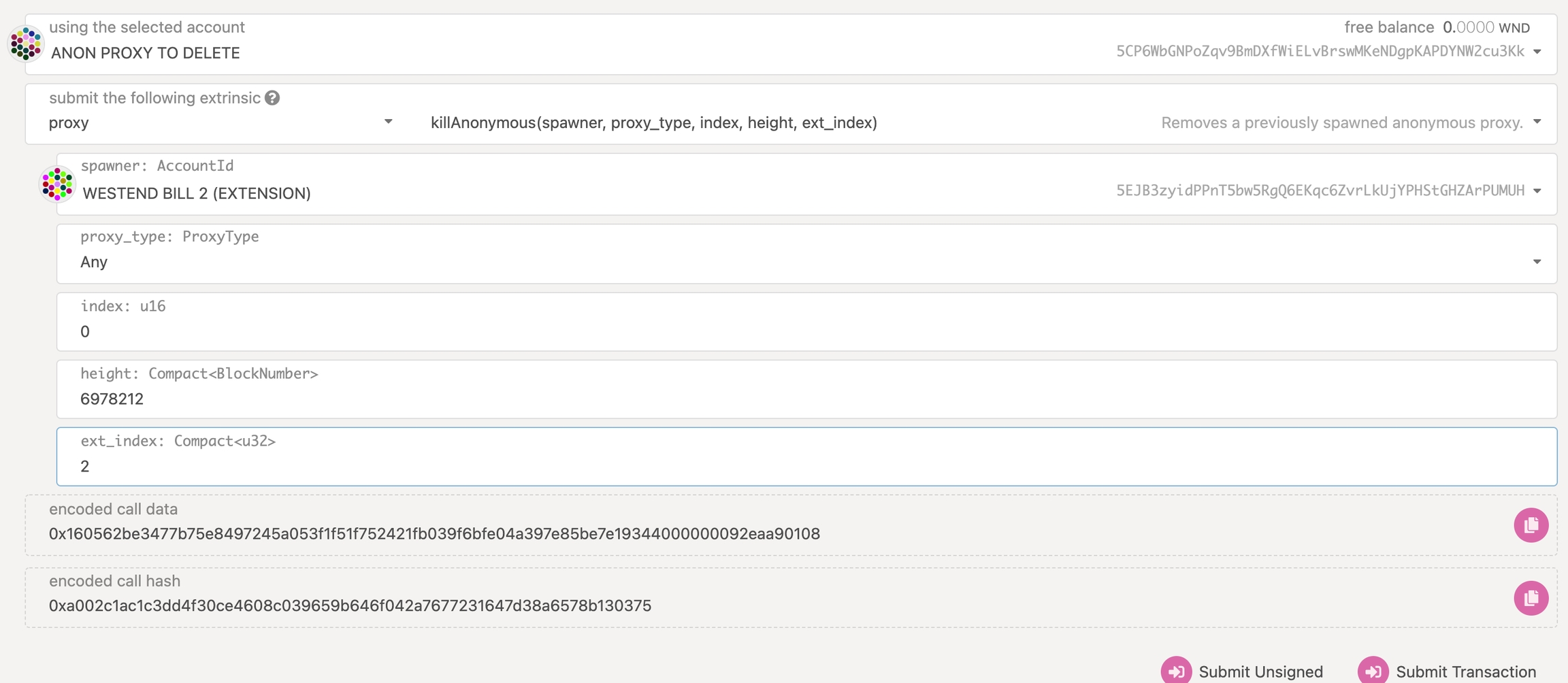 Proxiedand add your address, name itANON PROXY. You should now see this address in accounts. Now you need to callkillAnonymousfrom the anonymous proxy. It is important to note that anonymous proxies work backwards; the original account acts as the proxy.