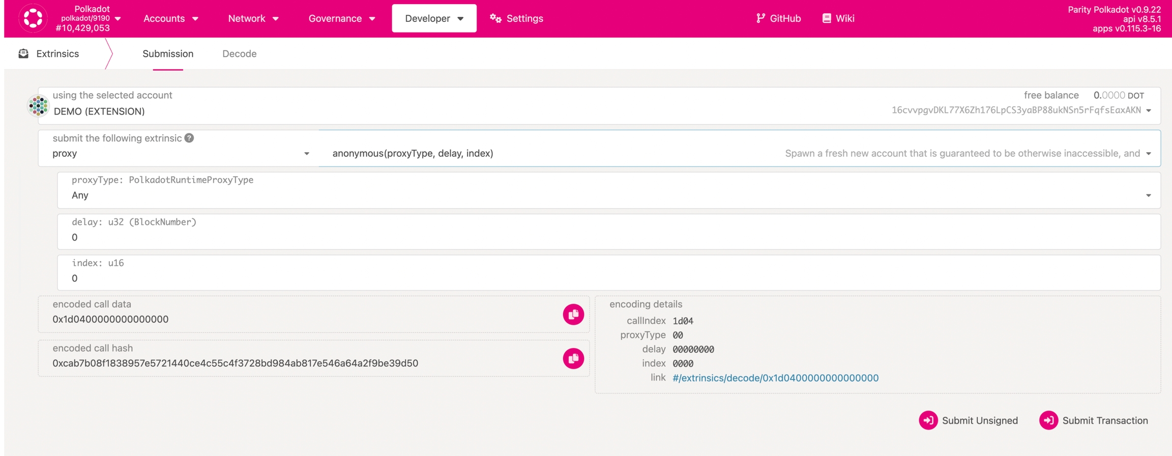 To set up a proxy, navigate to the Polkadot-JS UI and click on "Developer" > "Extrinsics". Here we will see a page that looks similar to this: