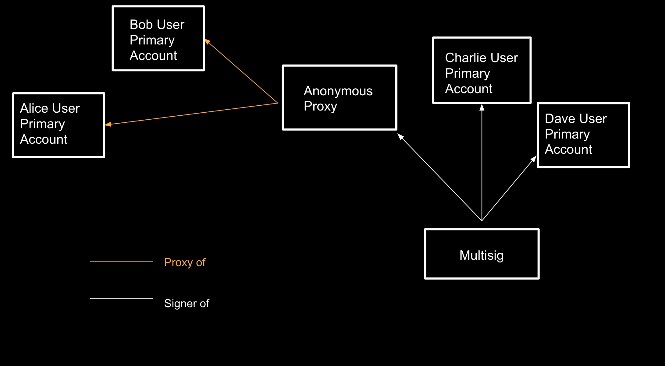 Anonymous proxies, in particular, can be used for permissionless management. In this example below, there is a multisig with four different accounts inside. Two of the accounts, Alice and Bob, have an anonymous proxy attached to them. In the case that the multisig account wanted to add or remove Alice or Bob or even add in a new account into the anonymous proxy, the anonymous proxy would take care of that change. If a multisig wanted to modify itself without an anonymous proxy, a whole new multisig would be created.