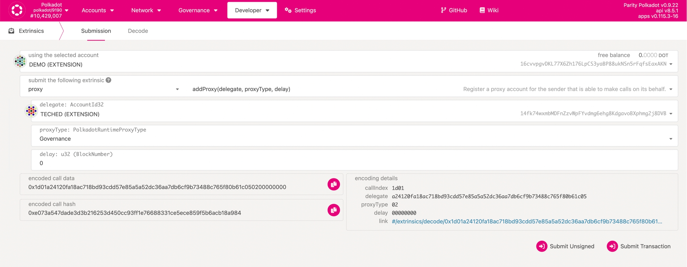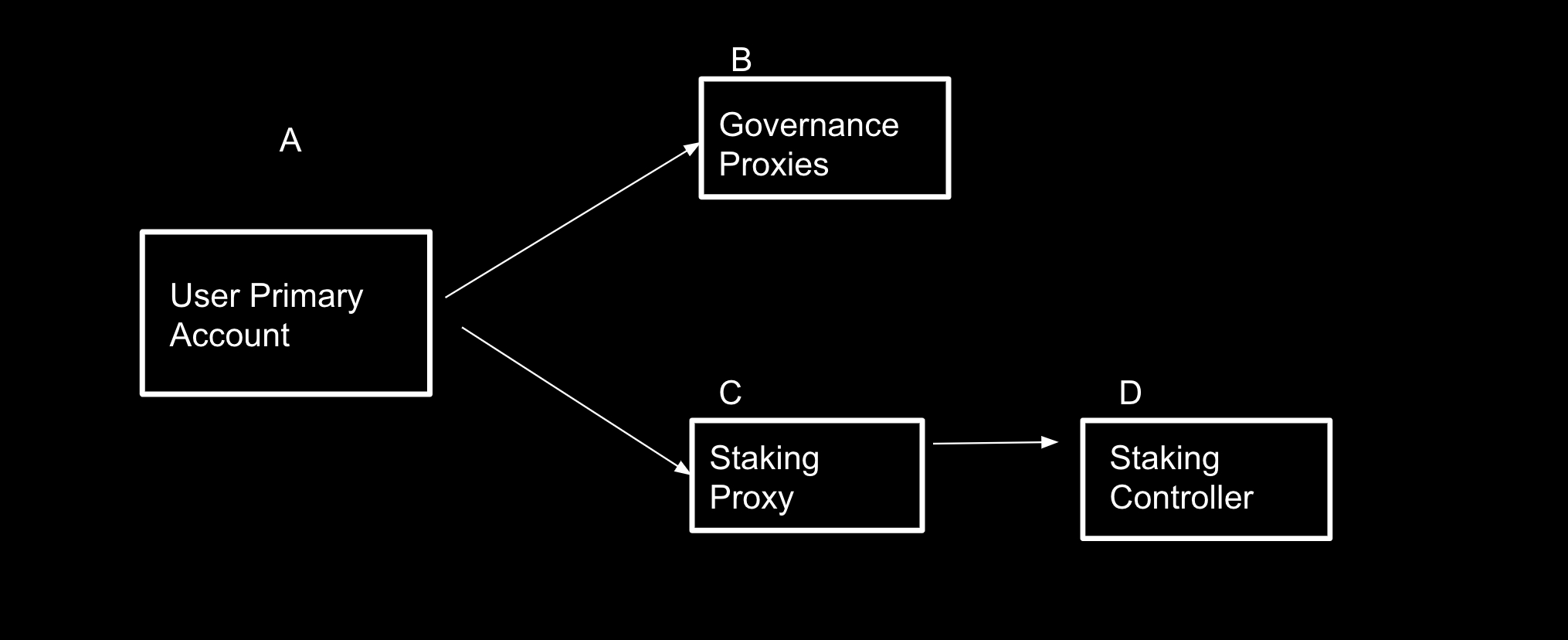 In this example, the primary account A would only make two transactions to set account B as its governance proxy and account C as its staking proxy. Now, account B could participate in governance activity on behalf of A.