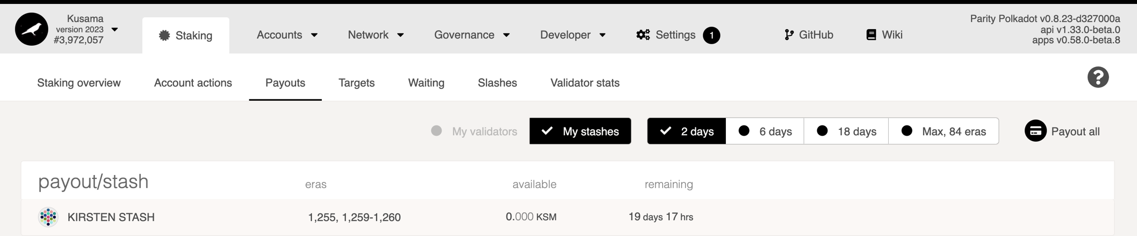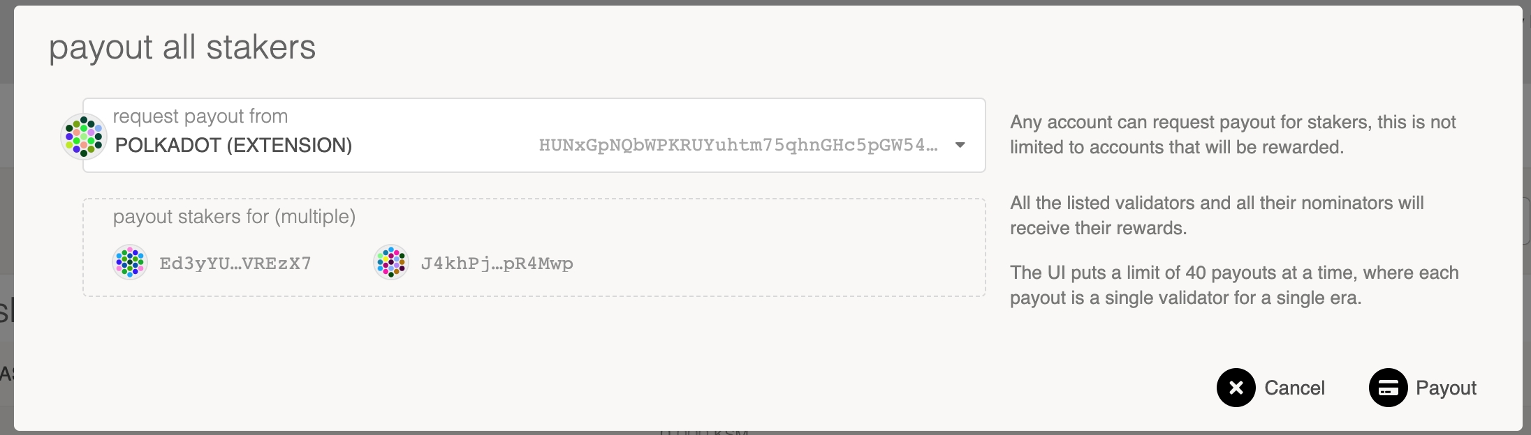 To then claim your reward, select the "Payout all" button. This will prompt you to select your stash accounts for payout.