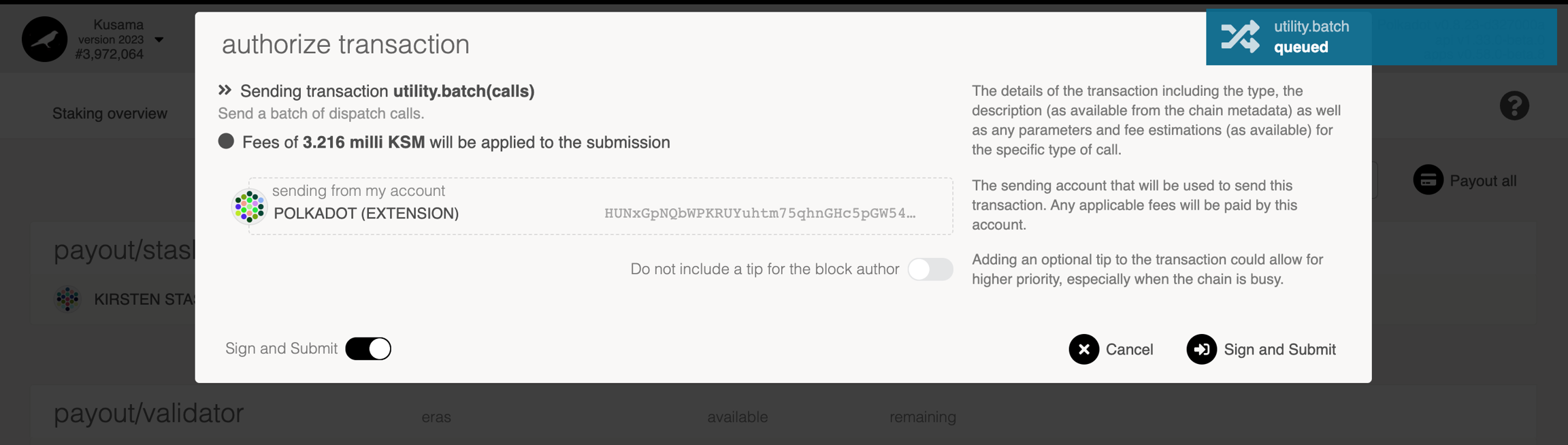 Once you are done with payout, another screen will appear asking for you to sign and submit the transaction.