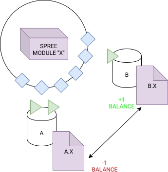 In the example, we assume that this SPREE module "X" contains the functionality for incrementing of decrementing the balance of a particular asset that is unique to this module.