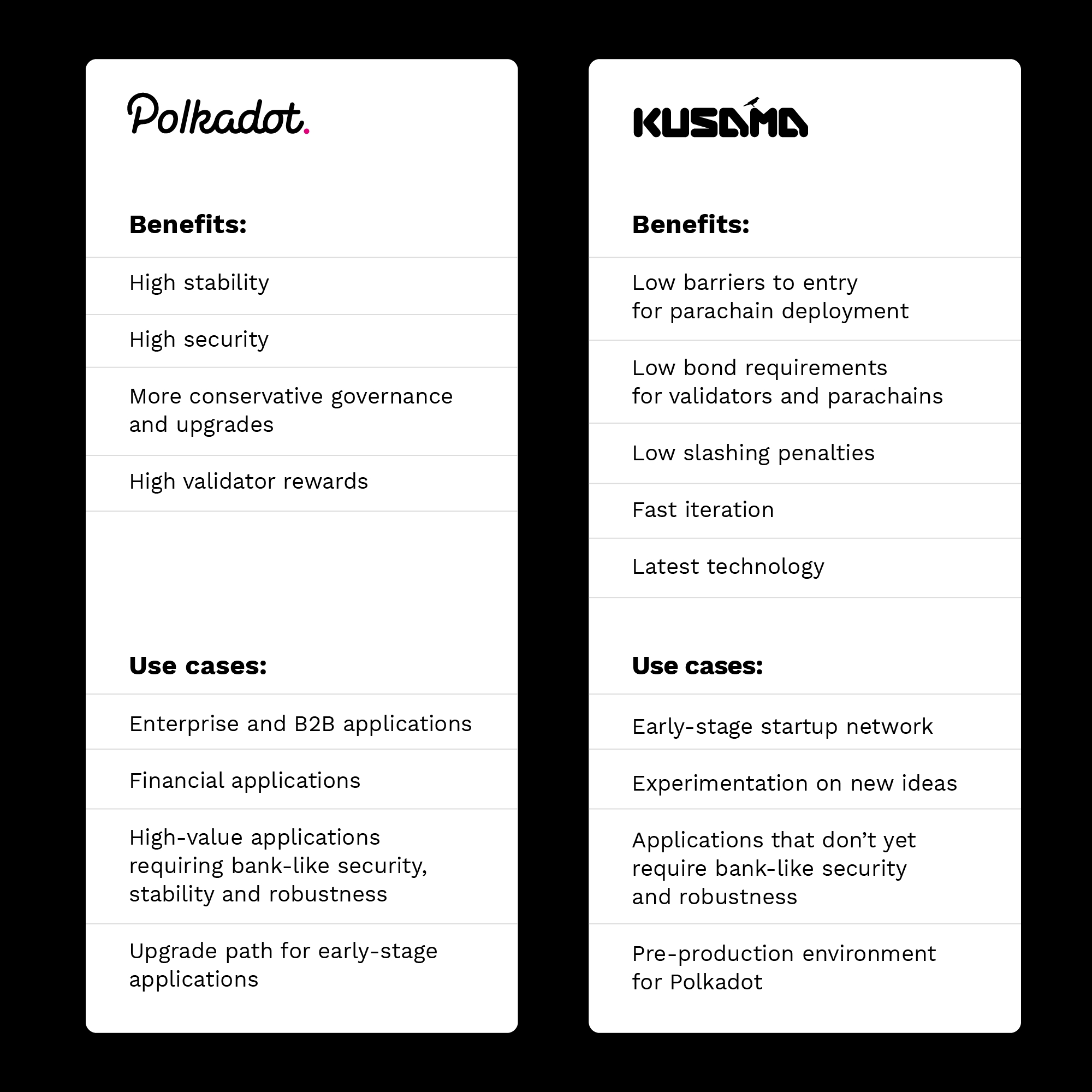 Many projects will maintain parachains on both networks, experimenting and testing new technologies and features on Kusama before deploying them to Polkadot. Some teams will decide just to stay on Kusama, which is likely to be a place where we see some exciting experimentation with new technologies going forward. Projects that require high-throughput but don’t necessarily require bank-like security, such as some gaming, social networking, and content distribution applications, are particularly good candidates for this use case.