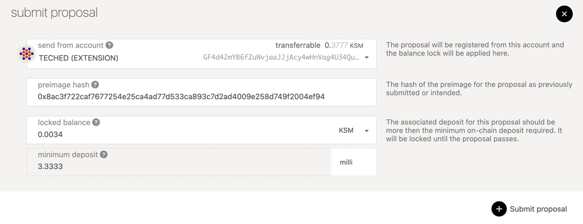 Now you will click on the "Submit proposal" button and enter the preimage hash in the input titled "preimage hash" and at least the minimum deposit into the "locked balance" field. Click on the "Submit proposal" button and confirm the transaction. You should now see your proposal appear in the "proposals" column on the page.