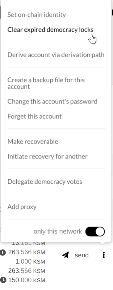 Now you can click the menu button (the three dots) and find the option that says "Clear expired democracy locks". After selecting this option you may confirm the transaction and your locks will be cleared when successful.