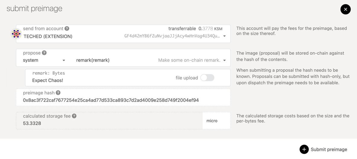 The example below demonstrates the creation of a proposal on Kusama (the same procedure applies to Polkadot). If you wanted to propose that a remark "Expect Chaos!" is added, the preimage hash would be 0x8ac3f722caf7677254e25ca4ad77d533ca893c7d2ad4009e258d749f2004ef94. You can copy this preimage hash and save it for the next step. There is no need to click Submit Preimage at this point, though you could. We'll go over that in the next section.
