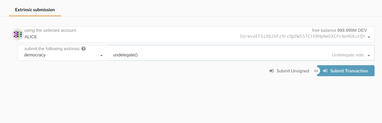 You may decide at some point in the future to remove your delegation to a target account. In this case, your tokens will be locked for the maximum amount of time in accordance with the conviction you set at the beginning of the delegation. For example, if you chose "2x" delegation for four weeks lock up time, your tokens will be locked for 4 weeks after sending the undelegate transaction. Once your vote has been undelegated, you are in control of making votes with it once again. You can start to vote directly, or chose a different account to act as your delegate.