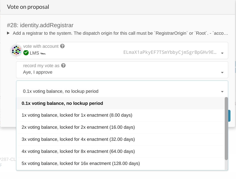 The important parameters to be aware of when voting using the Democracy module are as follow:
