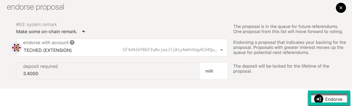 Endorsing a proposal means that you are agreeing with the proposal and backing it with an equal amount of deposit as was originally locked. The bonded tokens will be released once the proposal is tabled (that is, brought to a vote), just like the original proposer's bond. By endorsing a proposal you will move it higher up the rank of proposals. The most endorsed proposal — in value, not number of supporters — will be brought to a referendum every launch period.