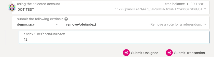 Navigate to the Extrinsics page and submit the following extrinsic: democracy.removeVote(index) using the account that you voted with. For the index number (ReferendumIndex), enter the number of the referendum for which you voted ("12" in the image below).