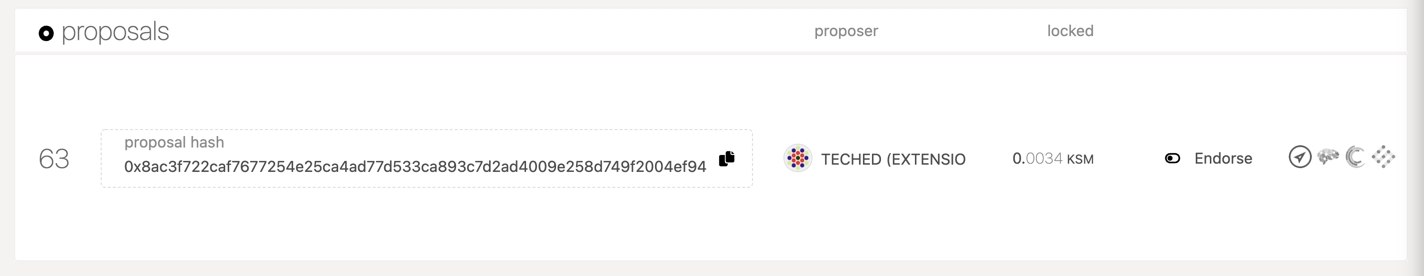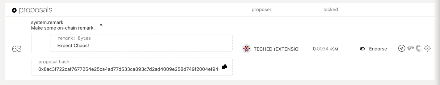 Now your proposal is visible by anyone who accesses the chain and others can endorse it or submit a preimage. However, it's hard to tell what exactly this proposal does since it shows the hash of the action. Other holders will not be able to make a judgement for whether they endorse it or not until someone submits the actual preimage for this proposal. In the next step you will submit the preimage.