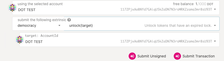 Now submit the following extrinsic: democracy.unlock(target), where target is your your account address.
