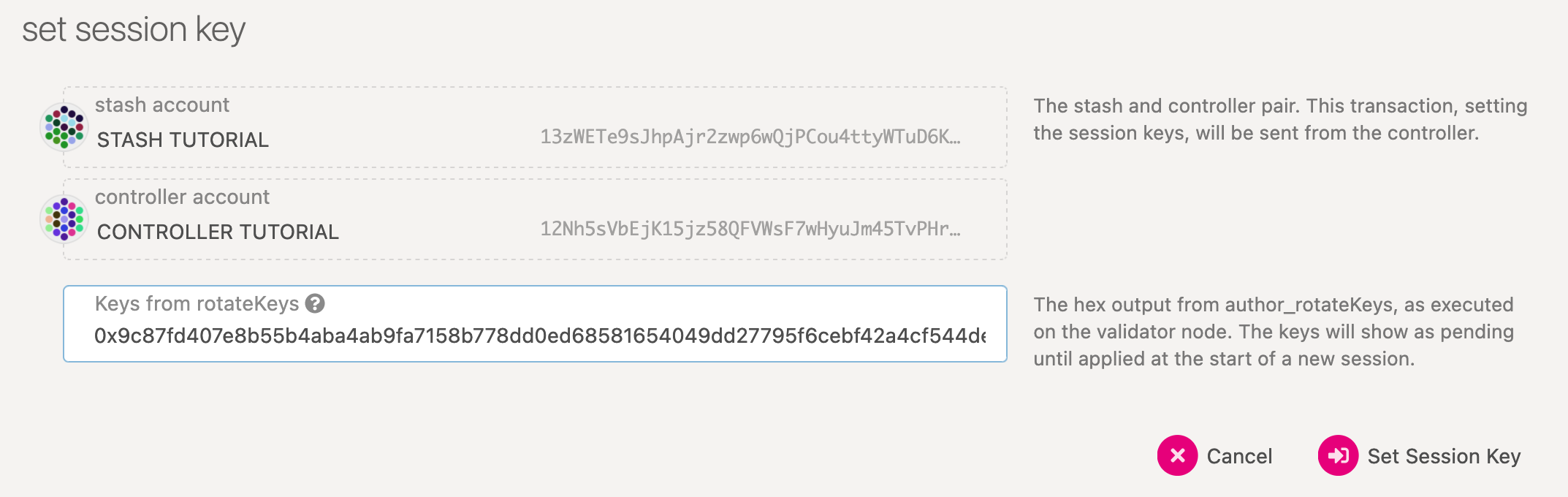 setKeys TransactionYou need to tell the chain your Session keys by signing and submitting an extrinsic. This is what associates your validator with your Controller account.