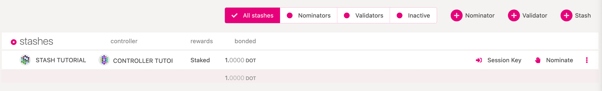 Your bonded account will available under Stashes. You should now see a new card with all your accounts (note: you may need to refresh the screen). The bonded amount on the right corresponds to the funds bonded by the Stash account.