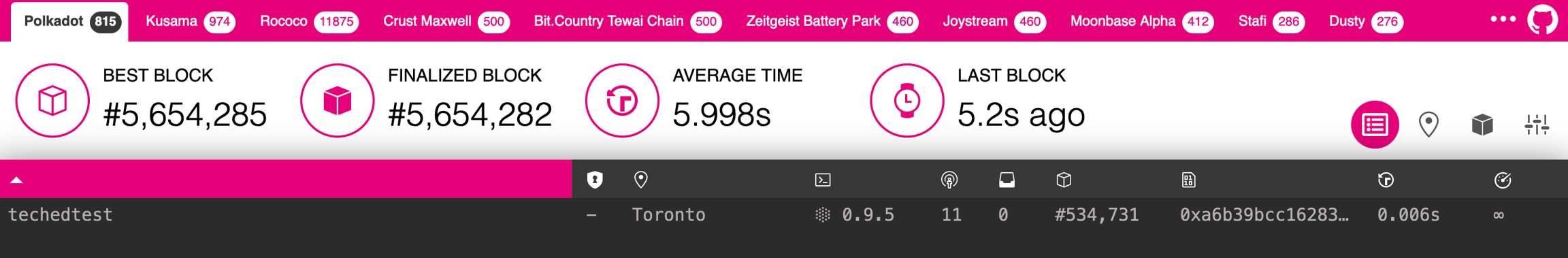 To verify that your node is live and synchronized, head to Telemetry and find your node. Note that this will show all nodes on the Polkadot network, which is why it is important to select a unique name!