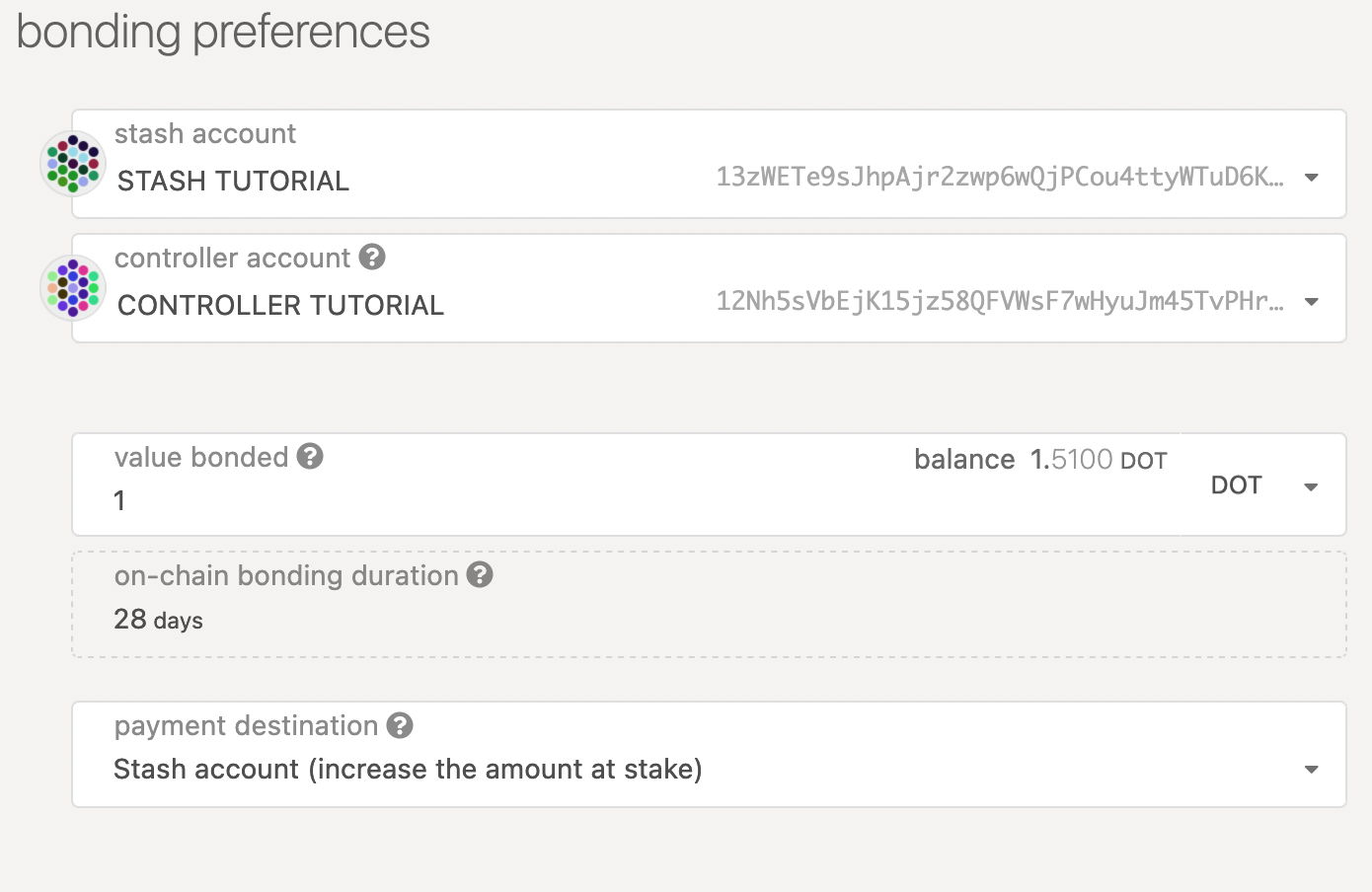 Stash account - Select your Stash account. In this example, we will bond 1 DOT, where the minimum bonding amount is 1. Make sure that your Stash account contains at least this much. You can, of course, stake more than this.