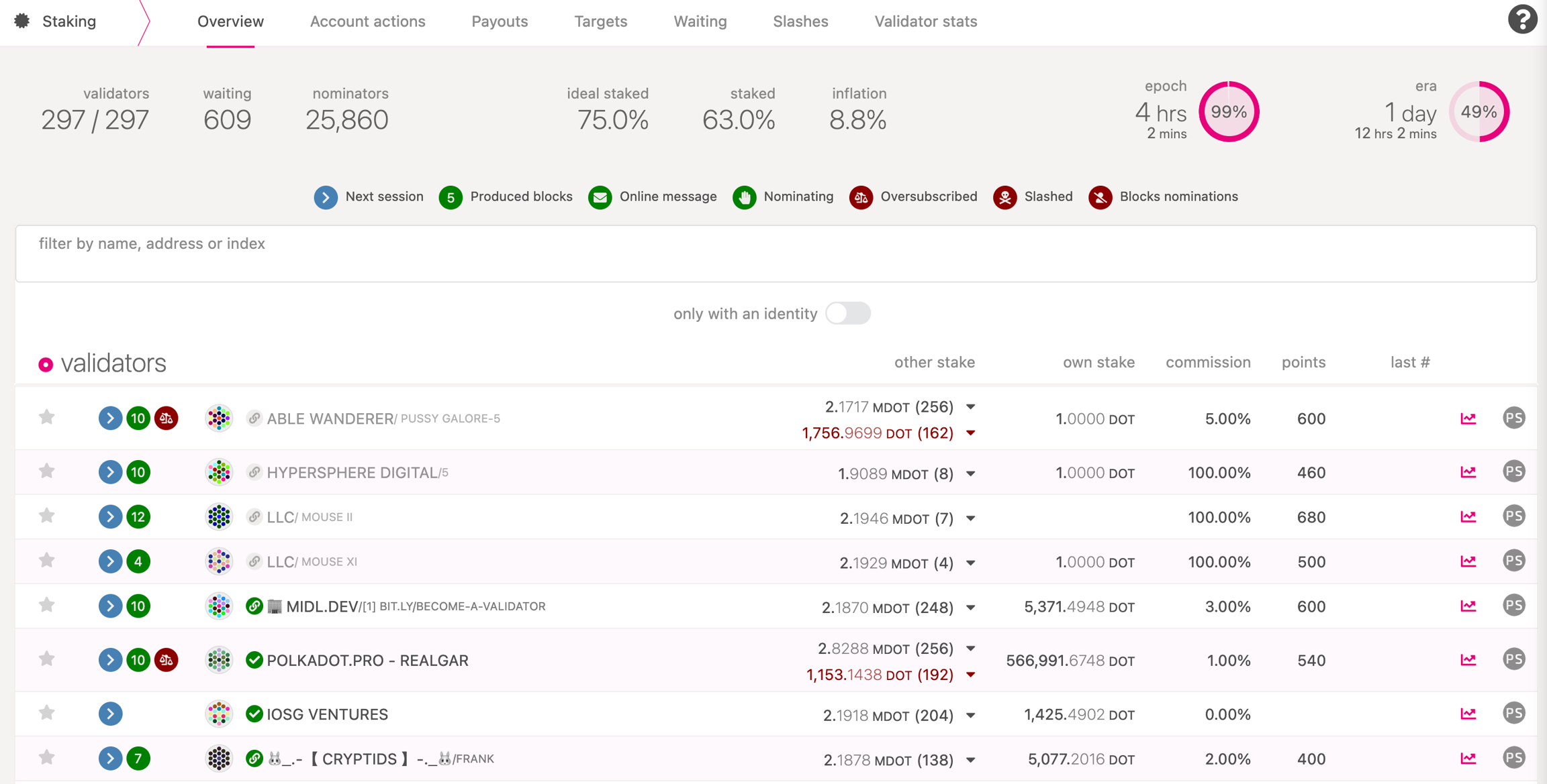 If you go to the "Staking" tab, you will see a list of active validators currently running on the network. At the top of the page, it shows the number of validator slots that are available as well as the number of nodes that have signaled their intention to be a validator. You can go to the "Waiting" tab to double check to see whether your node is listed there.