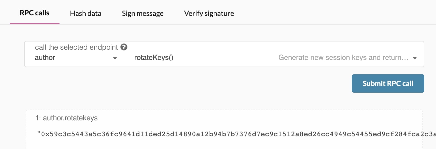 Once ensuring that you have connected to your node, the easiest way to set session keys for your node is by calling the author_rotateKeys RPC request to create new keys in your validator's keystore. Navigate to Toolbox tab and select RPC Calls then select the author > rotateKeys() option and remember to save the output that you get back for a later step.