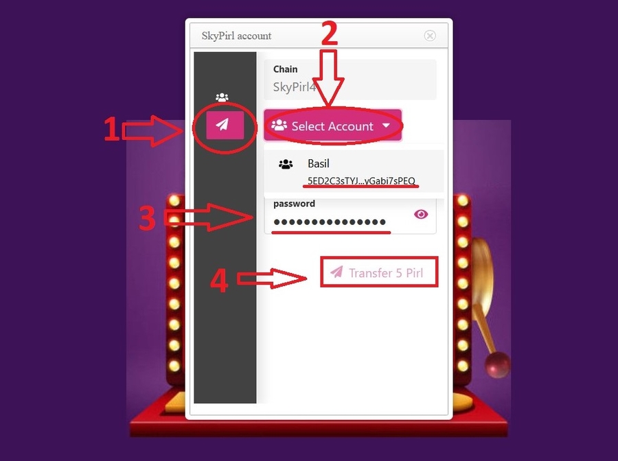 Step 5: You click on the coin transfer, then you choose the transfer account and click on the 5Pirl coin transfer to join the slot machine.
