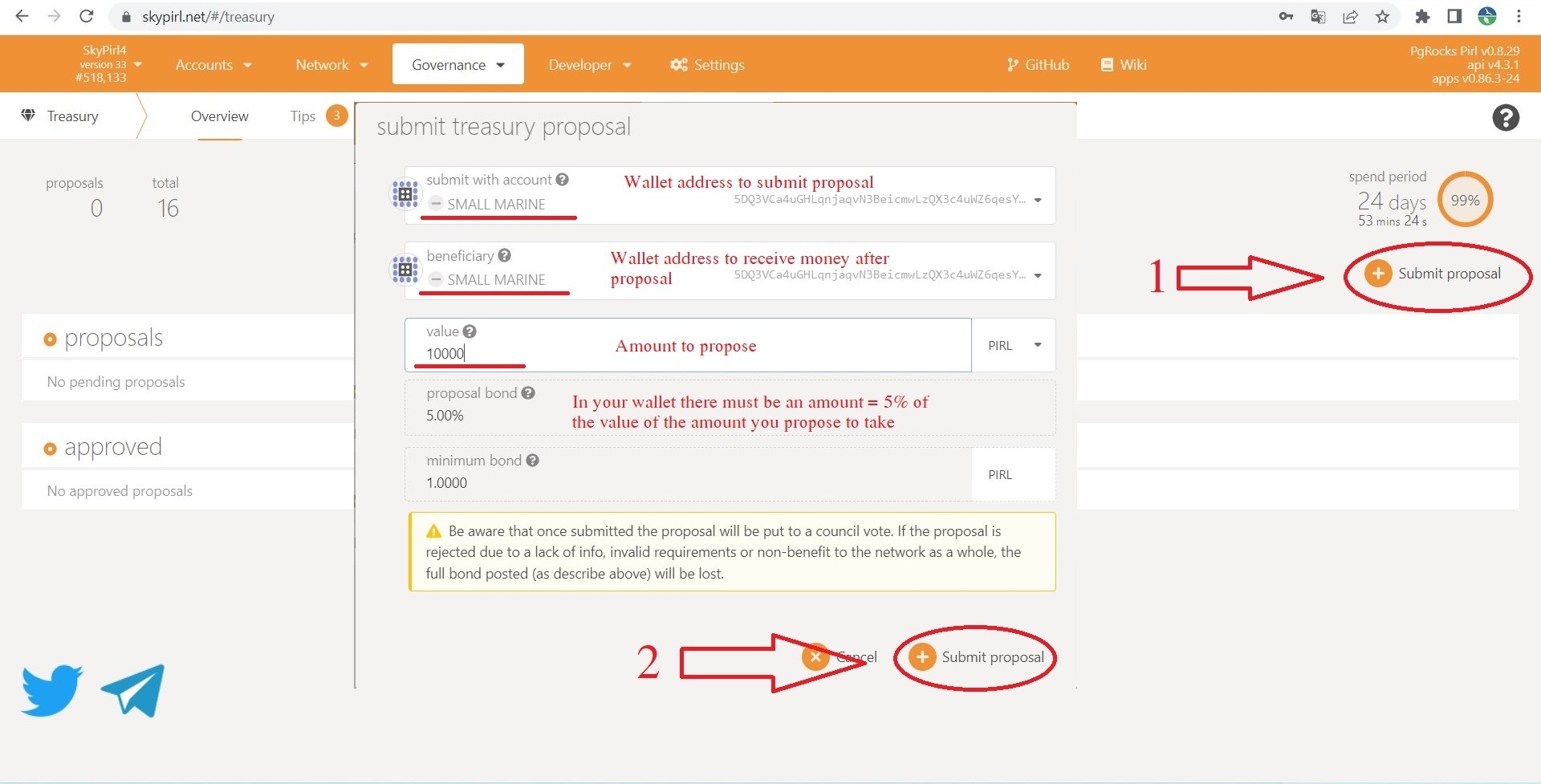 Note: The proposer's wallet will be locked 5% of the proposed amount. If the proposal is successful you will be returned 5%. If the proposal fails you will lose 5%, this money will be burned and you cannot get it back. This will keep people from spamming the treasury. For example you propose 1000 Pirl coin, then you will be locked 50 Pirl.