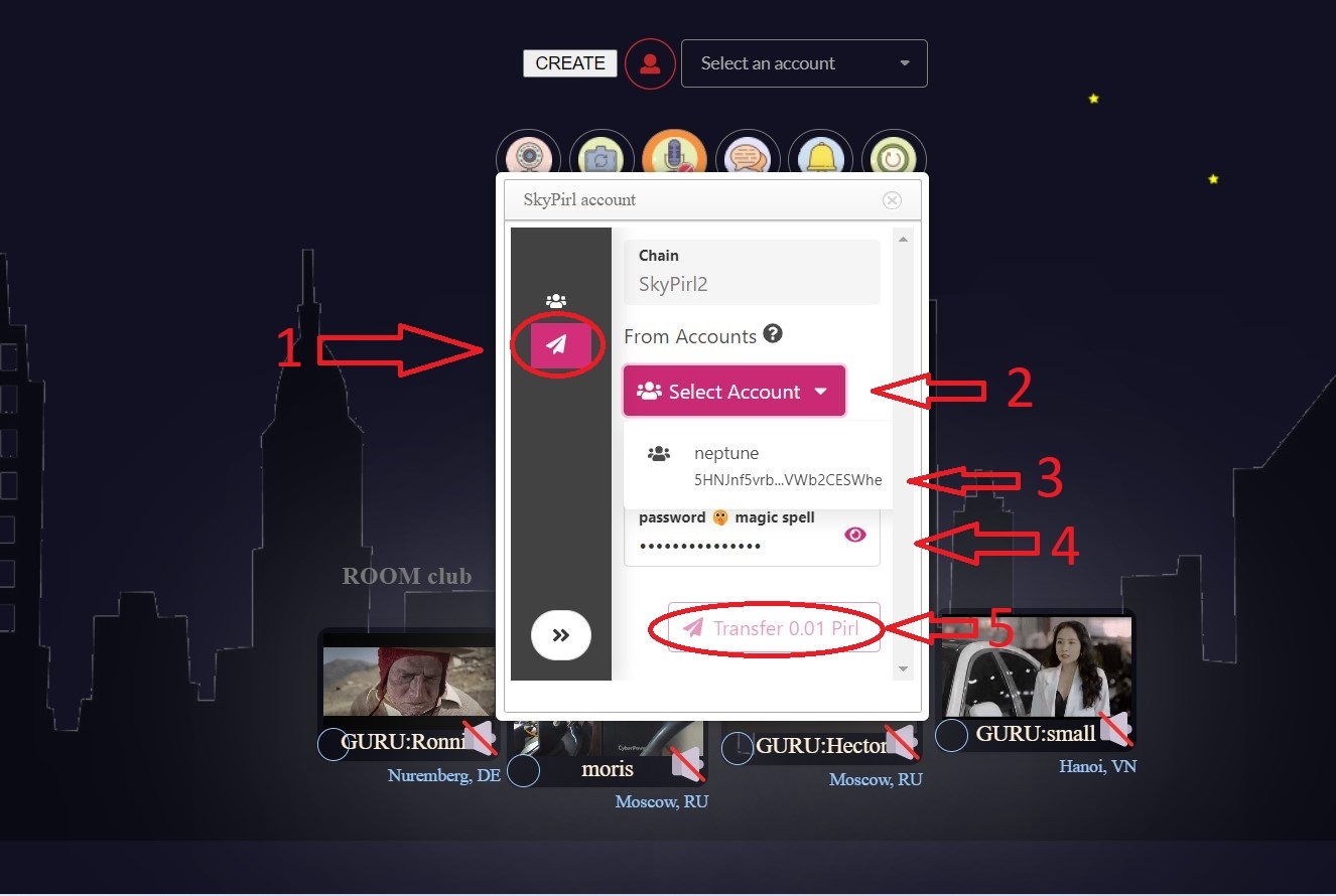 Step 3: After creating a wallet or restoring a wallet, to link an account with Room-House you must ensure that it has at least 0.011 Pirl coins on your wallet. Continue you transfer 0.01 Pirl from your account to Room-House service account. 0.01Pirl coin is the service fee of the dapp to link your account