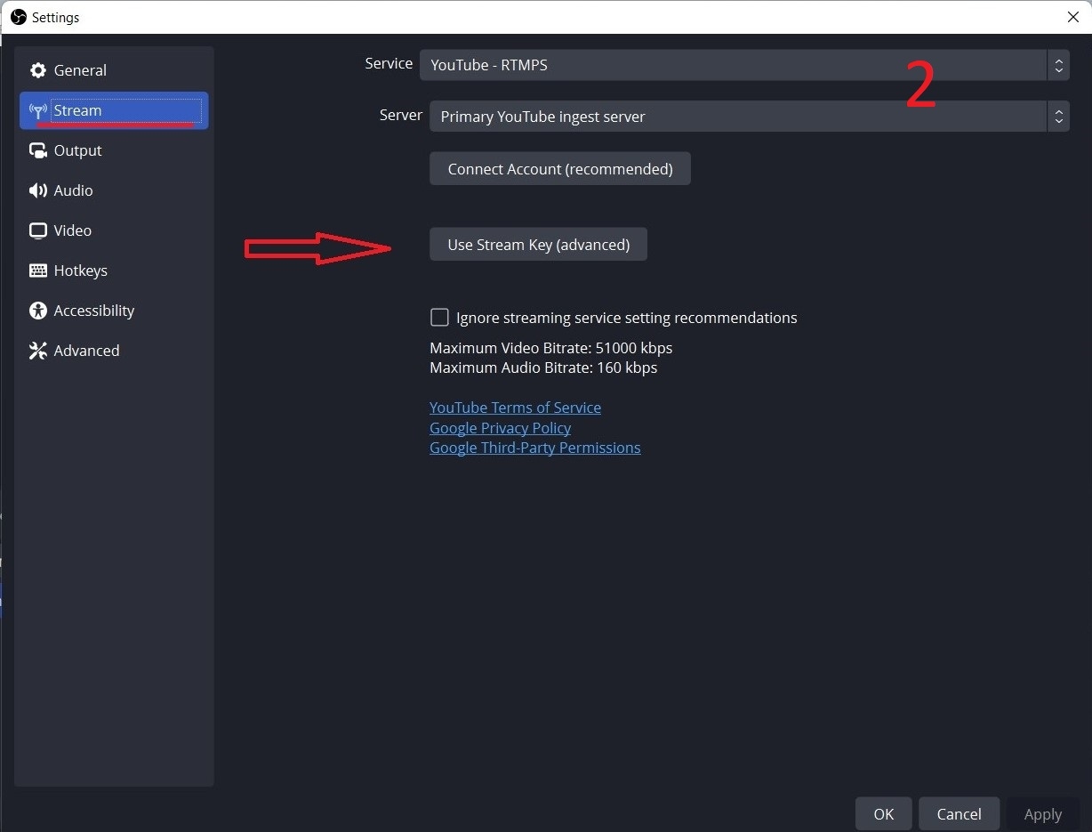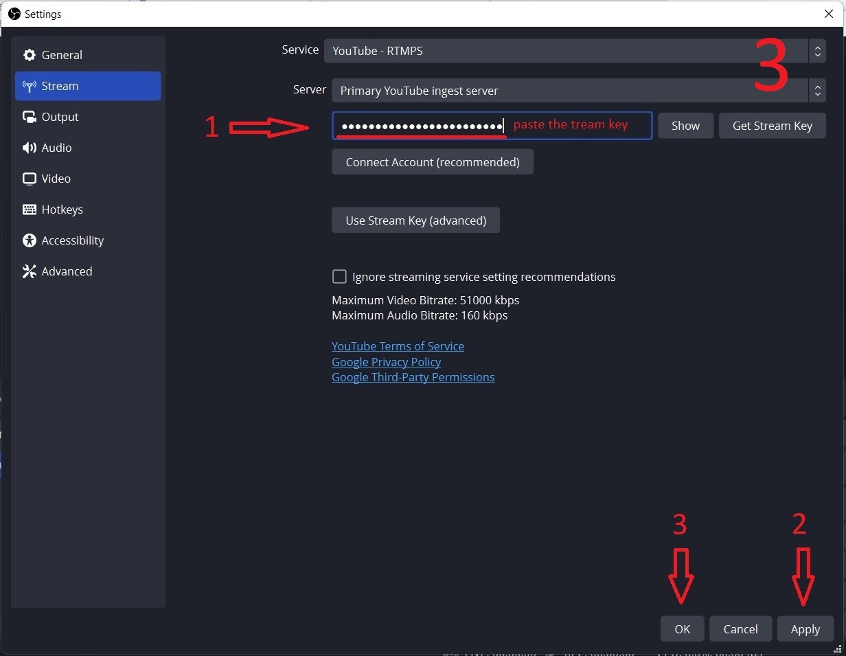 Step 1: you click "setting", then click "stream" and click "user stream key". Then you paste the code "stream key" click "Apply" and click "OK"