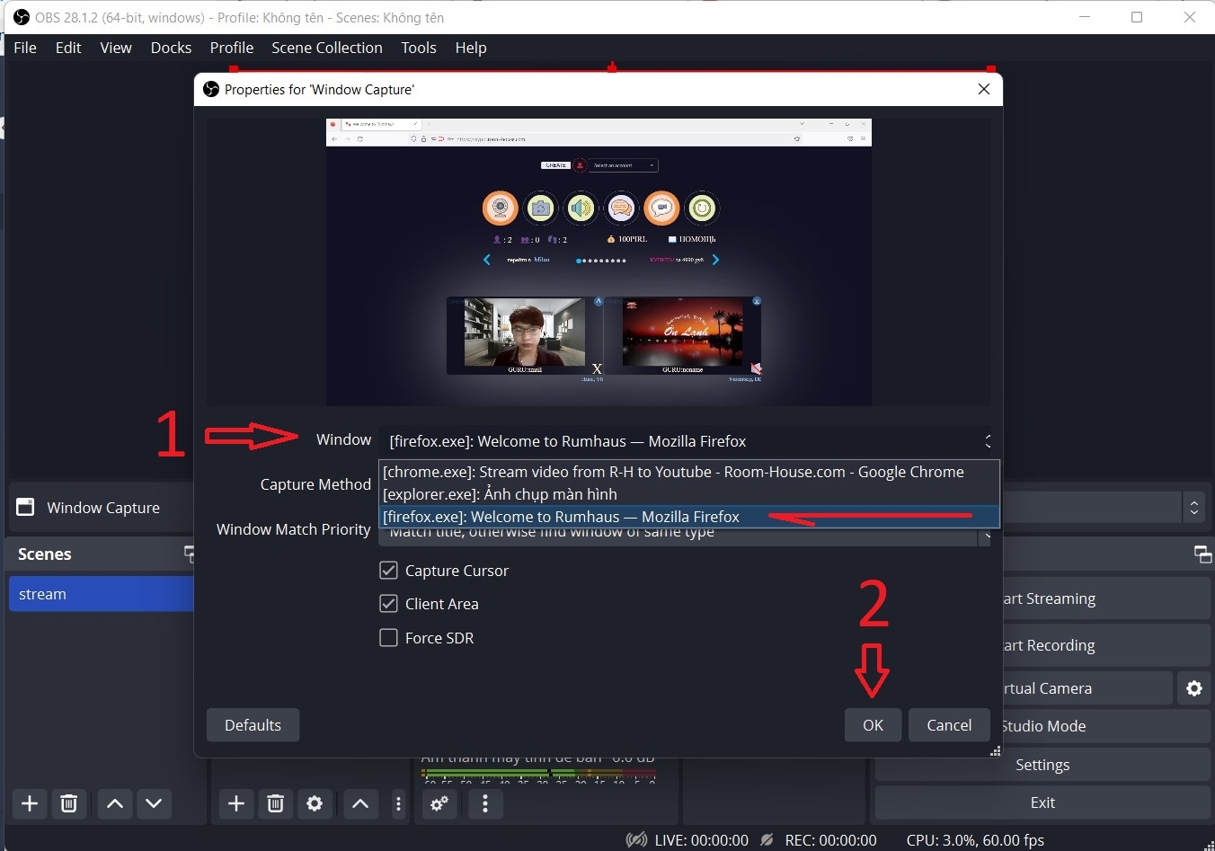 After you click on "Window capture" a new window will appear click on "window" and find your meeting room browser window.