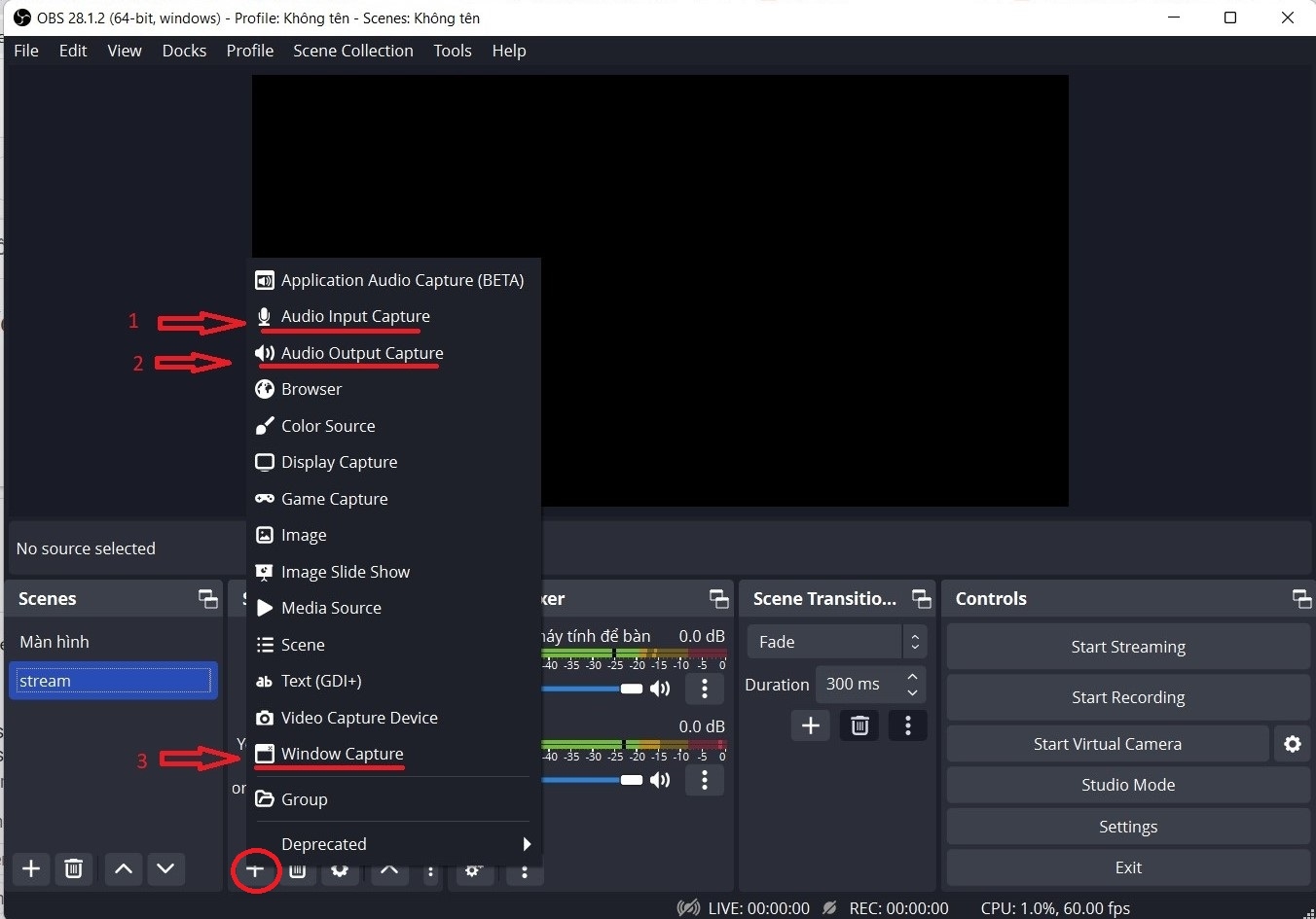 Step 3: you go to OBS studio, under "Sources" you click on "+" and select "Audio" and "Window capture"