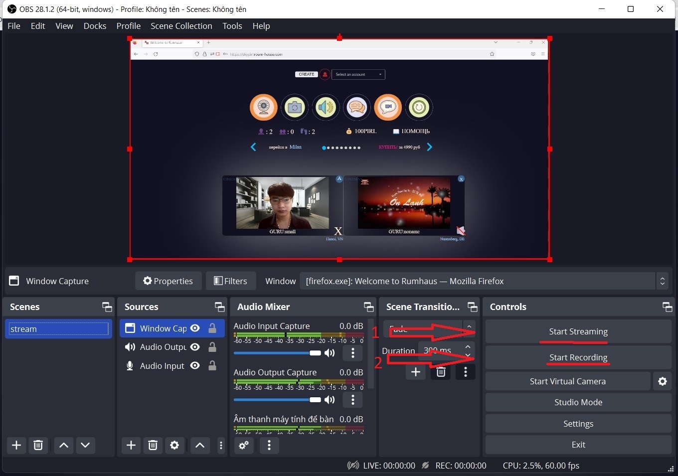 To record video, click "Start streaming" and "Start recording" at the same time.