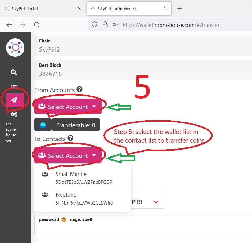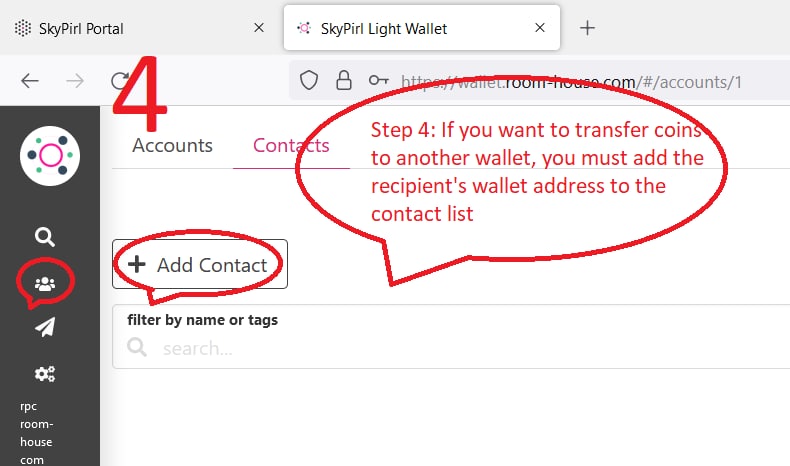 Step4: If you want to transfer coins to another wallet, you must add the recipient's wallet address to the contact list