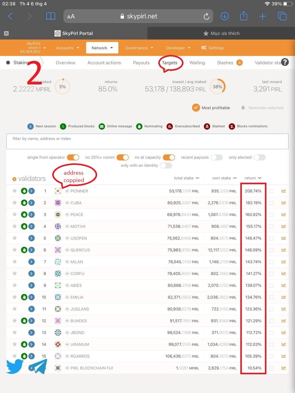 Step 2: select "Targets" and find the validator with the highest APR, then press copy the wallet address