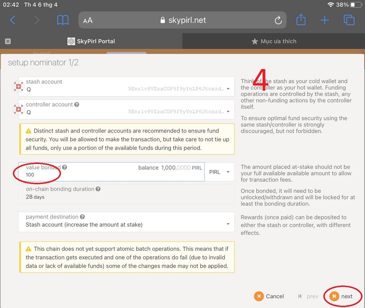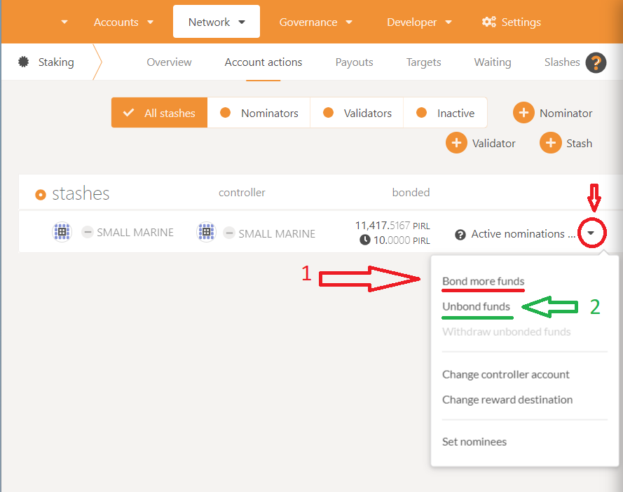 2To withdraw Pirl coin from the nomination that you do not want to withdraw, you click "Unbond Funds" then enter the amount of Pirl coin to withdraw. Note, the time is 28 days for the contract to withdraw to the personal wallet